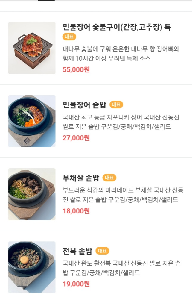 일단 저희가 시킨건 부채살/전복/민물장어 솥밥을 시켜서 먹었어요. 아 근데, 제가 배가 고파서 그런지 급하게 먹느라 제가 시킨 전복솥밥 말고는 못찍었어요.(ㅜㅜ) 그래서 사진은.... 네이버에 나와있는걸로 들고왔어요ㅜㅜ